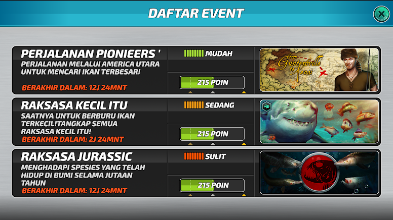 Dalam game simulator 3D ini kamu bisa menangkap berbagai jenis ikan seperti lele, bass, crappie, sunfish, trout, salmon, barakuda atau bahkan hiu! Targetkan untuk menangkap ikan bos yang langka dan ingatlah bahwa setiap spesies memiliki gayanya sendiri jadi pastikanlah kamu siap untuk menarik!